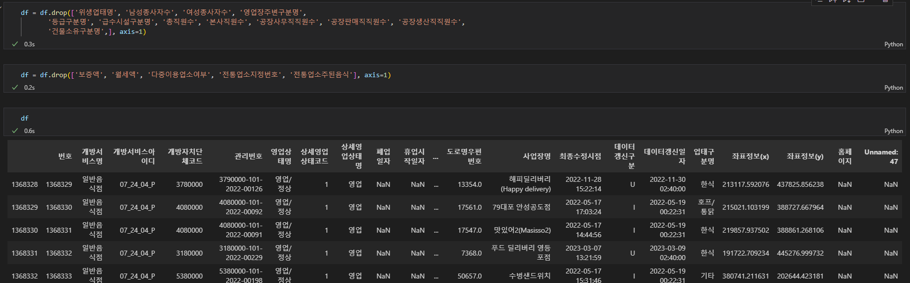 행정안전부_일반음식점 데이터를 기준으로 데이터 정리를 해보았다.