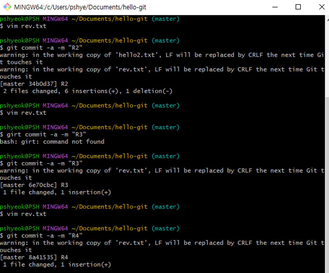 - vim rev.txt → git add rev.txt → 수정 git commit -a -m “R2” … R4 까지 커밋을 한다.