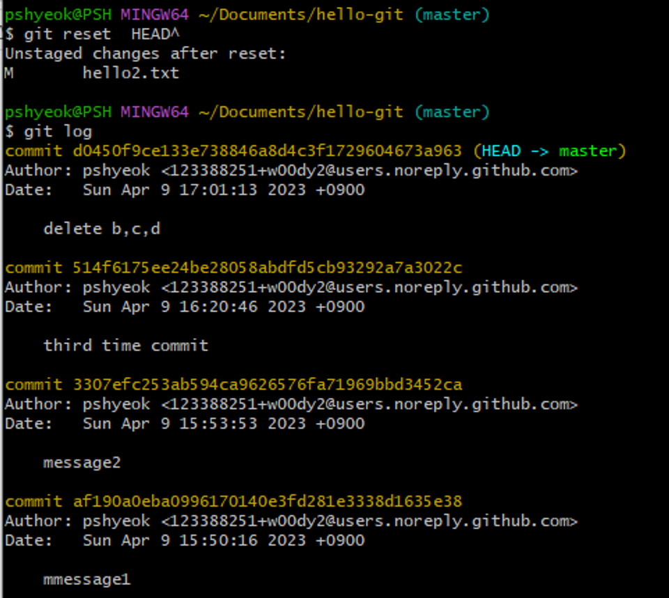 - vim hello2.txt를 수정,, git commit -am “message4” 커밋