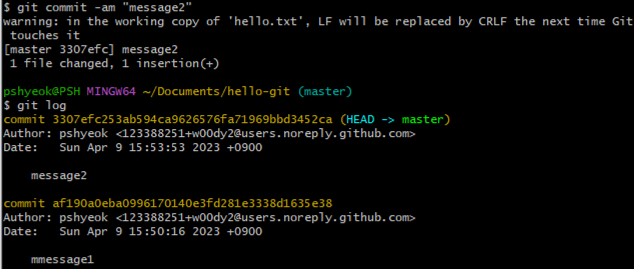 파일을 수정한 이후 git commit -am을 이용하여 커밋을 하게되면 두번째 버전의 정보도 나타난다.