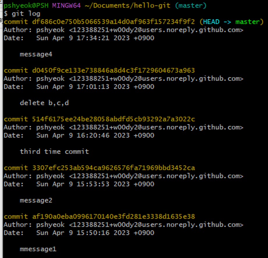 - vim hello2.txt를 수정,, git commit -am “message4” 커밋