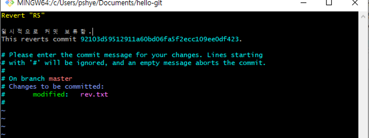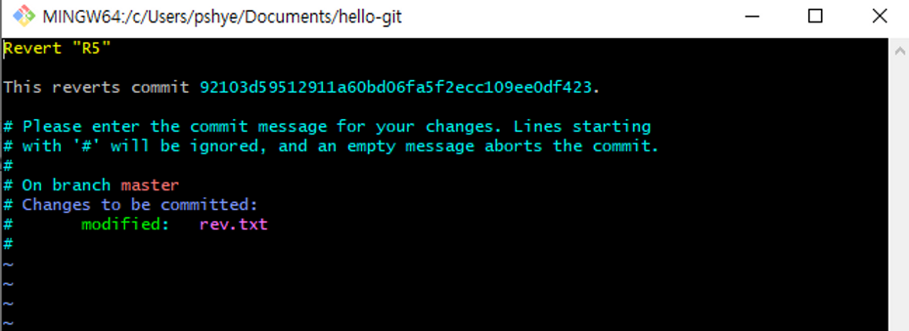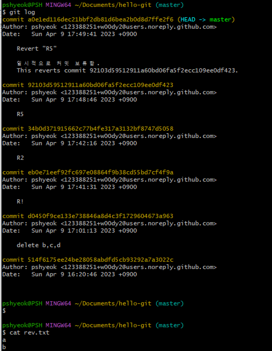 - vim rev.txt → git add rev.txt → 수정 git commit -a -m “R2” … R4 까지 커밋을 한다.