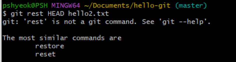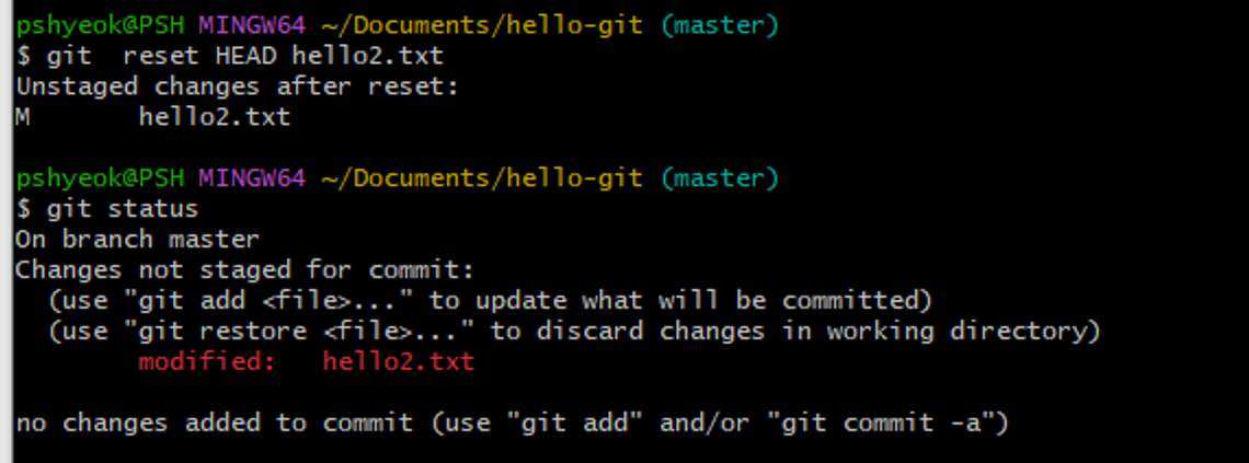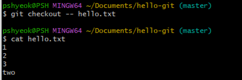 2. git checkout — hello.txt → git checkout — + 수정을취소할 파일 이름.