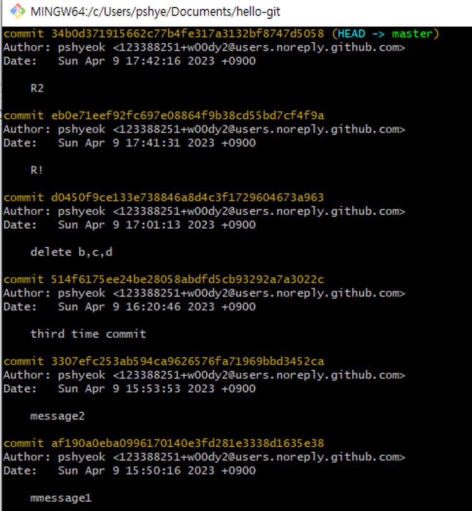 5. $ git log를 확인하면 R2가 최신로그가 된다.