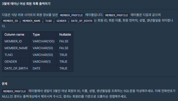 SQL01. 3월에 태어난 여성 회원 목록 출력하기