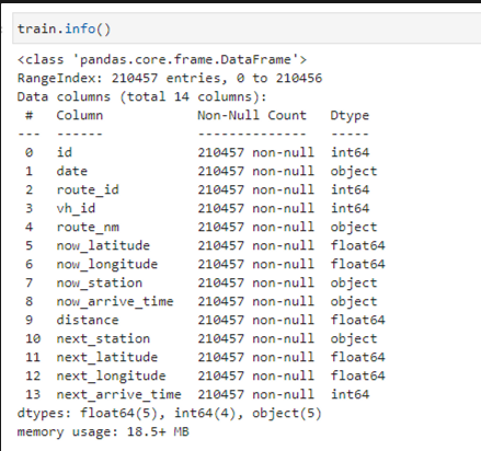 train.info() : 길이, 특성의 이름, 결측치의 수 등을 확인해볼 수 있다.