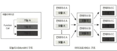 - 모놀리스를 대체할 수 있는 방식이 마이크로서비스 구조